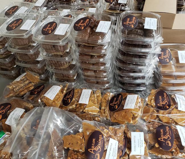 Apron Strings Candy started with a simple toffee recipe. Thomas used a lot of trials and mostly errors to create her first recipe. Once she had it perfected she gave most of it away and people fell in love with the taste. Her first successful candy and sale was for traditional English Toffee and it has remained one of the best sellers.