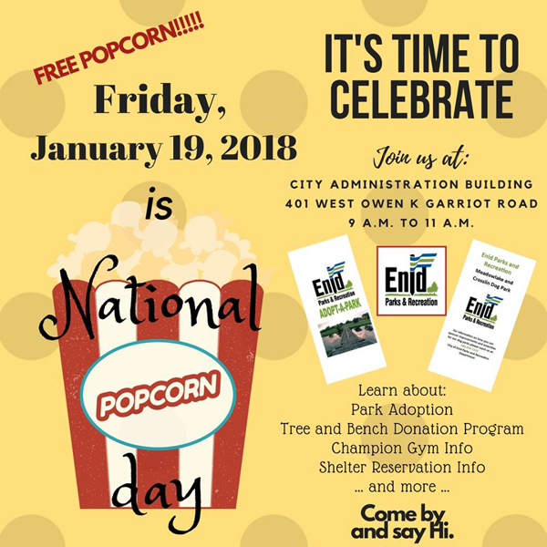 ENID, OK (January 18, 2018) – Friday, January 19, 2018 is National Popcorn Day and the City of Enid Parks department is participating by offering popcorn and city park information to the public.