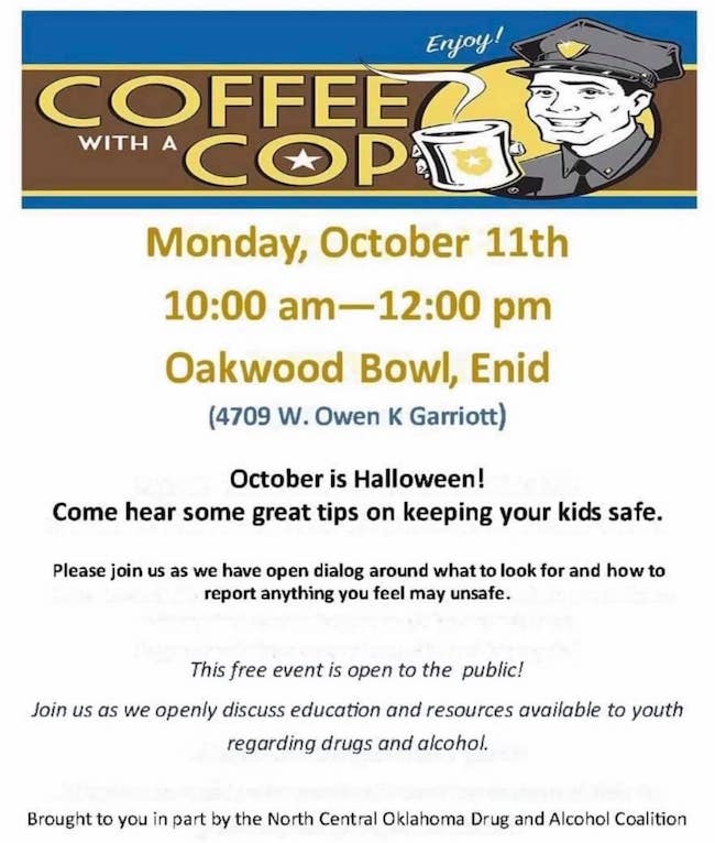 ENID, OK - Oakwood Bowl is hosting Coffee With A Cop on Monday, October 11 from 10:00am to 12:00pm. Join your neighbors and police officers for coffee and conversation. Located at 4709 W. Garriott..