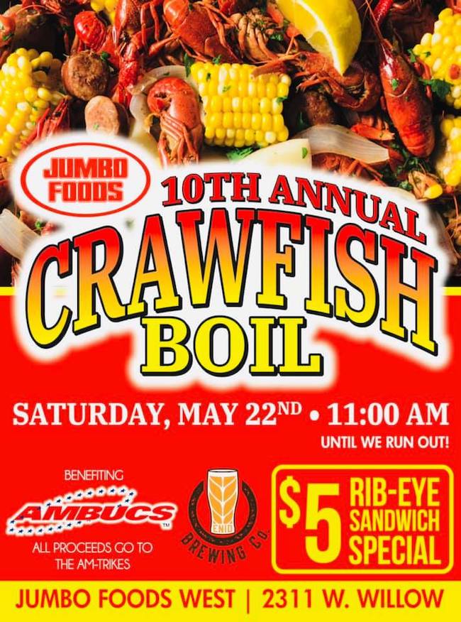 ENID, OK - Enjoy the Jumbo Foods 10th Annual Crawfish Boil on Saturday, May 22 from 11:00am until the run out. Cooked Crawfish will be available and Rib-Eye Sandwiches with Chips and a Drink is $5.00!