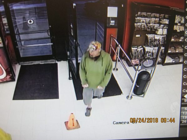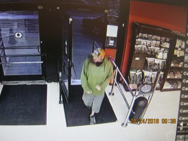 ENID, OK - On August 24th, 2018 a report was taken by the Enid Police Department if reference to a Burglary to an Auto. The victim stated that taken during the burglary was a brown purse and a debit card. Officers were advised that the debit card had been used at SAV-A-LOT , 917 E. Broadway. The security video shows a white male, wearing gray shorts, a green hooded sweatshirt, and an orange and multi colored baseball hat use the stolen debit card to make a purchase. Attached are photographs of the subject from the security video.