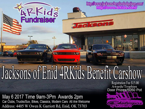 ENID, Okla. - Challengers of Oklahoma and Jackson's of Enid is hosting a Car Show to benefit 4RKids on Saturday, May 6 from 9:00am to 3:00pm. Car registration fee is $15. Awards and trophies will be awarded as well as door prizes and a 50/50 pot.