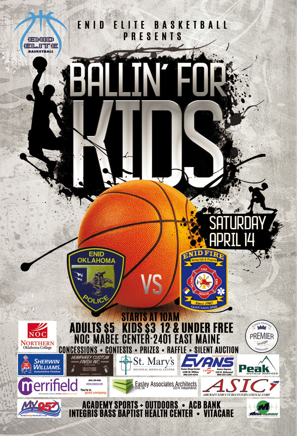 ENID, OK - Enid Elite Basketball is hosting a fundraising event on April 14, at Northern Oklahoma College’s Mabee Center. This event, “Ballin’ for Kids,” is a round robin tournament featuring Enid’s very own Police Department, Fire Department and Enid Elite’s finest coaches and parents. This event will be a family friendly event for all ages.
