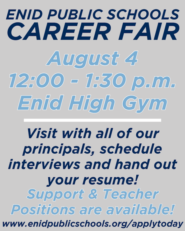 ENID, OK - You are invited to the EPS Career Fair on August 4 from 12-1:30pm in the Enid High Gym! Support and teacher positions are available. Take your resume!