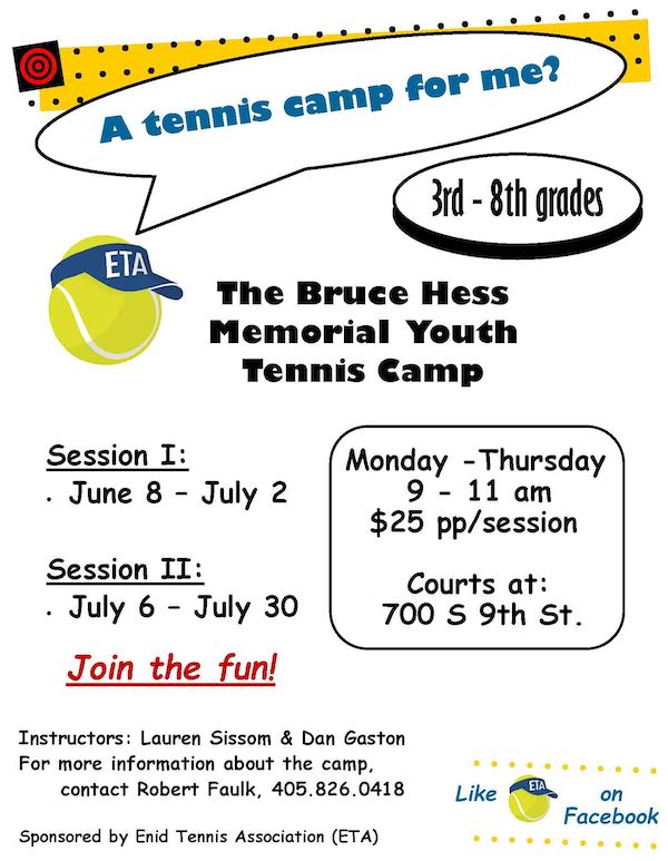 ENID, OK - The Enid Tennis Association is sponsoring an 8 week tennis camp for kids entering grades 3-8. The first session was June 8-July 2 and the second session is July 6-July 30. Times are Monday through Thursday from 9 a.m. to 11 a.m. at the “9th Street Tennis Courts” at 700 S. 9th in Enid, OK.