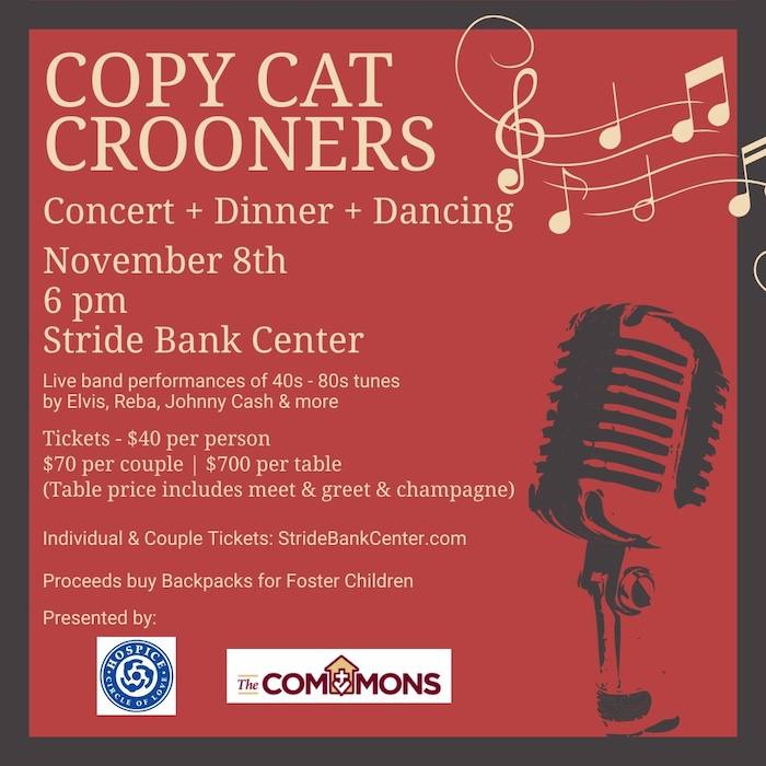 Friday is the last day to purchase DINNER tickets to Copy Cat Crooners. A general admission ticket has been added for those wanting to attend but not have dinner. Proceeds go towards purchasing backpacks for foster children.