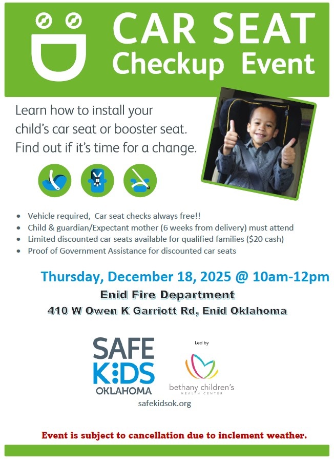 It's that time again! Take advantage of the awesome community support provided by the Safe Kids Worldwide event! Stop by the Enid Fire Department on Thursday, December 18 from 10am to 12pm, 410 W. Garriott.