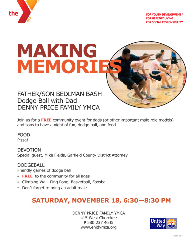 Enid, OK - The YMCA's annual Father/Son Bedlam Bash is Saturday November, 18 from 6:30pm-8:30pm. Join them for dodge ball with dad (or other important male role models) and pizza! There will be ping pong, basketball, foosball, and climbing wall open. Special guest Mike Fields, Garfield County District Attorney will be saying a quick devotion as well. This is a free event for all ages.