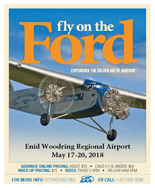 ENID, OK - Fly on the Ford May 17-20, 2018 at the Enid Woodring Regional Airport. Recall the energy, passion, and excitement of the Roaring ’20s by flying aboard the Ford Tri-Motor. Known as the first luxury airliner, the Ford Tri-Motor redefined world travel and marked the beginning of commercial flight.