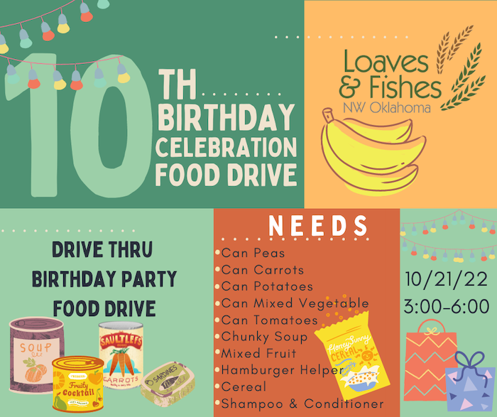 ENID, OK - Loaves & Fishes will hold their 10th annual Birthday Party Drive Thru Food Drive on Friday, October 21 from 3:00-6:00pm. Stop by 701 E. Maine.