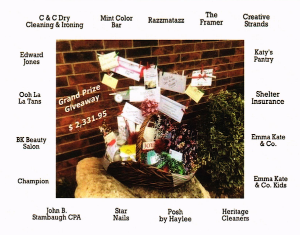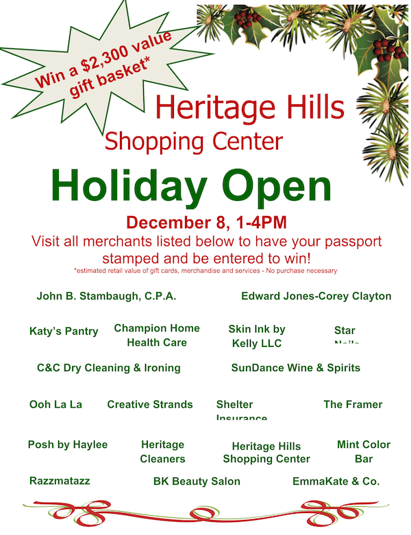 Participating stores include John B. Stambaugh, C.P.A., Edward Jones - Corey Clayton, Katy's Pantry, Champion Home Health Care, Skin Ink by Kelly LLC, Star Nails, C & C Dry Cleaning & Ironing, SunDance Wine & Spirits, Ooh La La, Creative Strands, Shelter Insurance, The Framer, Posh by Haylee, Heritage Cleaners, Heritage Hills Shopping Center, Mint Color Bar, Razzmatazz, BK Beauty Salon and EmmaKate & Co.