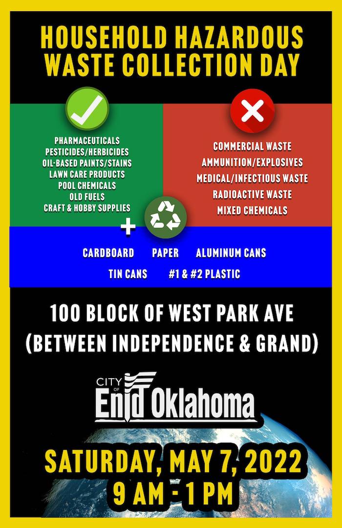 ENID, OK - The City of Enid announced today a Household Hazardous Waste Collection Day event slated for Saturday, May 7th from 9 a.m. to 1 p.m. at 100 West Park Avenue.