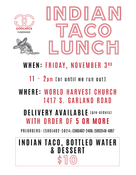 ENID, OK - GodChics with World Harvest Women's Ministries will be making Authentic Indian Tacos this Friday, November 3 from 11:00-2:00pm or until they run out. Delivery is available with 5 or more pre-orders.