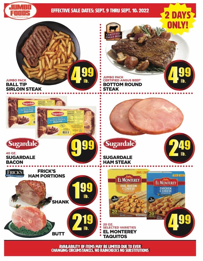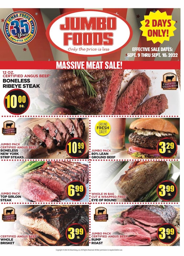 ENID, OK - Jumbo Foods will be having a two day Massive Meat Sale! This Sale begins Friday, Sept. 9 and runs thru Saturday, Sept. 10, and prices will be available at all three locations.