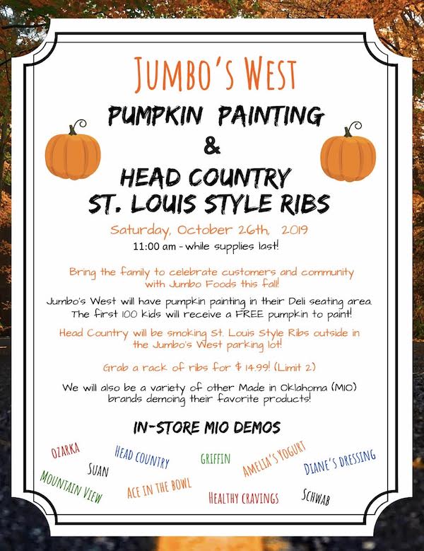 ENID, OK - Jumbo Foods West presents Pumpkin Painting and Head Country St. Louis Style Ribs on Saturday, October 26 beginning at 11:00am, while supplies last. Located in Willow Plaza at Willow and Cleveland.