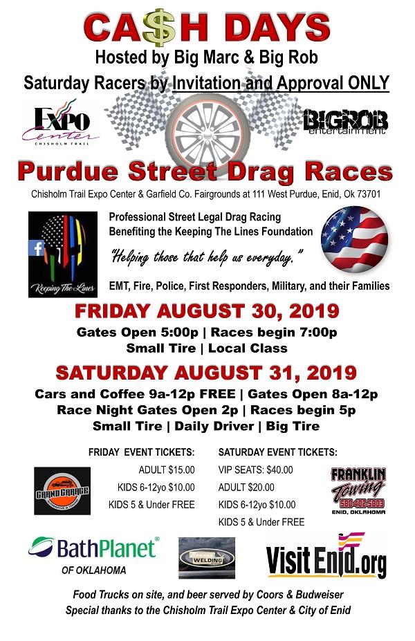 ENID, OK - Professional Street Legal Drag Racing is coming back to Enid, Oklahoma on Friday and Saturday, August 30-31. Cash Days is a fundraising event hosted and produced by Big Marc and Big Rob. Proceeds will benefit the Keeping The Lines Foundation.