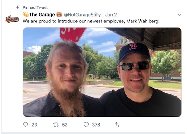Earlier in the year, Damon was pictured at The Garage in Stillwater and they posted the photo on their Twitter account. They joked that he was their newest employee, Mark Wahlberg.