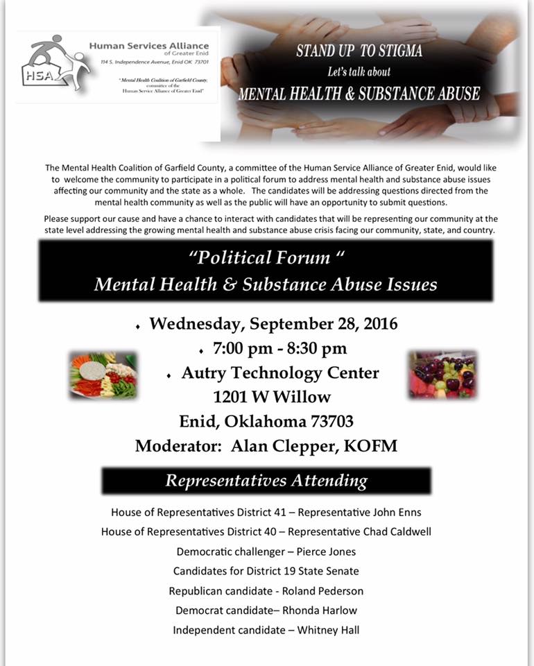 ENID, Okla. - The Mental Health Coalition of Enid and Garfield County is very pleased to present a Candidate Forum on Wednesday, September 28th from 7:00-8:30pm at Autry Technology Center. If you care about mental health and substance abuse issues affecting Enid, please make plans to attend!