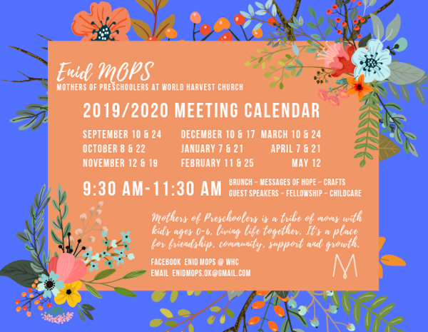 Registration is now open to participate in Enid MOPS – Mothers of Preschoolers. For more information or to register, find them on Facebook – Enid Mops at WHC or visit the website at www.mops.org/groups/enidmops. You can also email them at enidmops.ok@gmail.com.