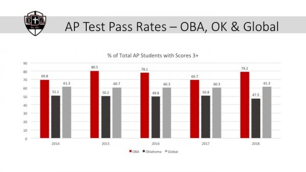 ENID, OK - Oklahoma Bible Academy is proud to celebrate the outstanding achievements of our 2018 Advanced Placement (AP) students. During the 2017-18 school year, OBA students had a test pass rate of 71.9%. The pass rate for all students in Oklahoma was 47.5%, and the pass rate for all students who took AP tests globally was 61.3%.