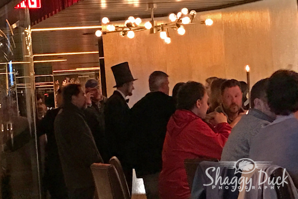 On inauguration night we stopped by a random restaurant we happened to be passing two blocks from the White House. It was called Ocean Prime and was very good. They sat us in a large window booth at the corner of 14th St. NW and G St. NW. We were able to watch people dressed in tuxedos and ball gowns walk to assorted balls. We saw protesters in large groups pass by one way while lines of police passed the other way. At one point an interesting character even stopped by to eat.