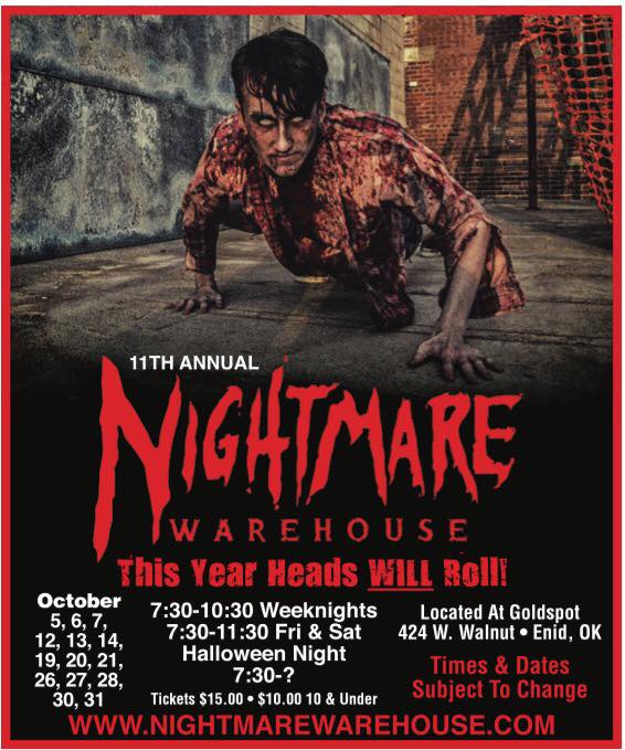 Nightmare Warehouse is Enid Oklahoma's Ultimate haunted warehouse! Ranked in Oklahoma Haunted House Review's top 5! Over 20 minutes of frightening adventure awaits you and your friends! What once was the old Goldspot Dairy has now been transformed into an amazingly detailed haunt. Hand built sets around every corner including live actors as well as some of the newest animatronics in the Haunt industry today! They are locally owned and operated and do this for the pure fun of Halloween!
