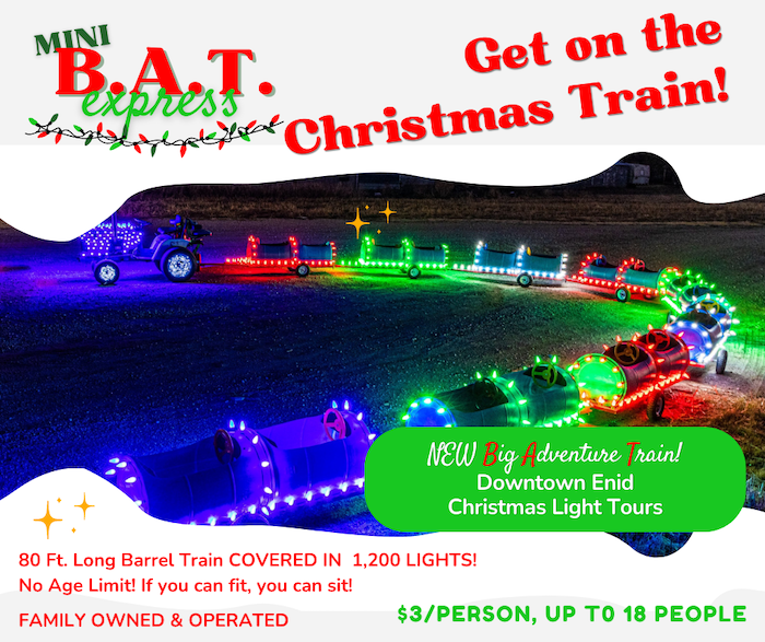 New this year is the Mini B.A.T. Express! The Mini is an 80 foot barrel train covered in 1,200 Christmas lights! The Big Adventure Train provides tours through Downtown Enid, which features Holidays on Ice and The One Enid, the world’s tallest fresh cut Christmas tree.
