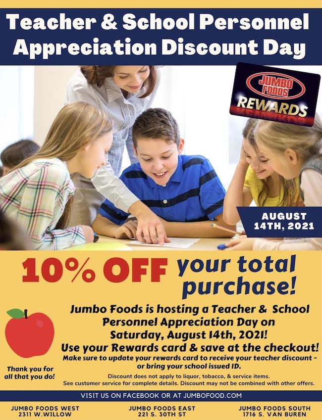 ENID, OK - Jumbo Foods wants to thank local teachers and school employees for their hard work and dedication with Teacher Appreciation Day. They will be giving a 10% discount all day Saturday, August 14 at all Jumbo Foods locations for school employees in Garfield County (alcohol, tobacco and service items excluded). Simply show some type of school identification for the discount.