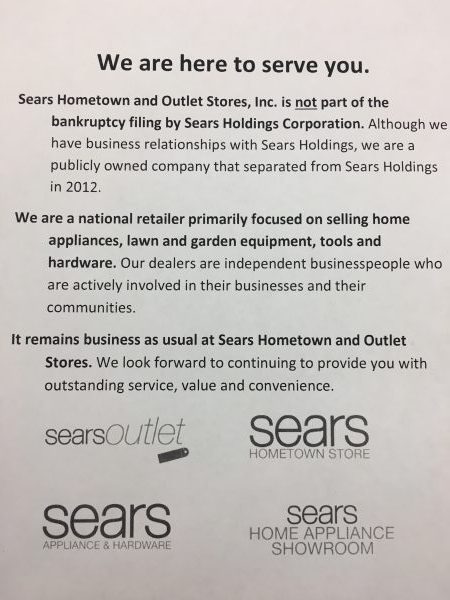 "Sears Hometown and Outlet Stores Inc. is NOT part of the bankruptcy filing by Sears Holdings Corporation. Although we have business relationships with Sears Holdings, we are a publicly owned company that separated from Sears Holdings in 2012. We are a national retailer primarily focused on selling home appliances, lawn and garden equipment, tools and hardware. Our dealers are independent businesspeople who are actively involved in their businesses and their communities. It remains Business as usual at Sears Hometown and Outlet Stores. We look forward to continuing to provide you with outstanding service, value and convenience."