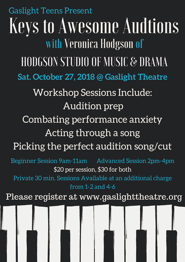 ENID, OK - Musical theatre director and voice teacher Veronica Hodgson will teach Gaslight's young actors how to prepare a fantastic musical theatre audition. From general audition preparation and picking the perfect audition song to acting through a song and fighting stage fright, this dynamic workshop will cover it all.