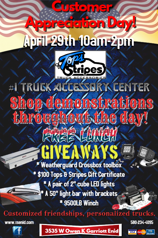 Located at 3535 W Owen K Garriott Rd, Enid, OK 73703. Call (580) 234-4095 or visit www.tsenid.com for more information. Email: sales@topsandstripes.com.